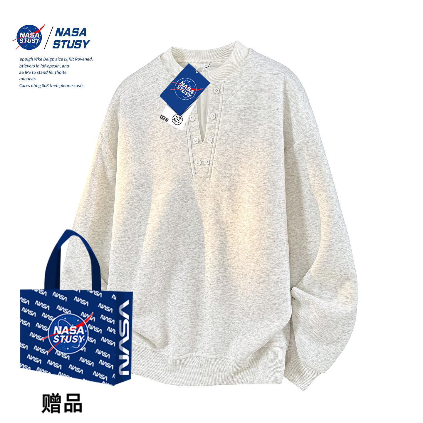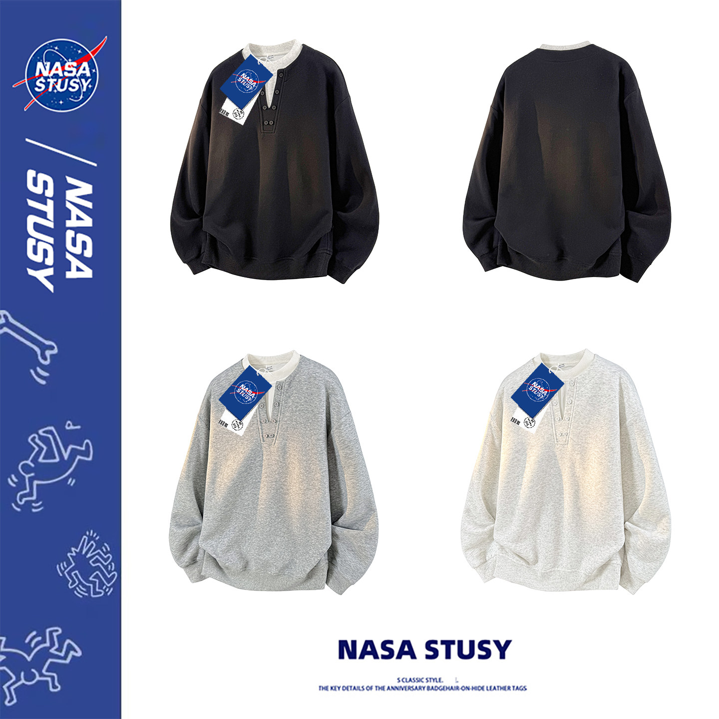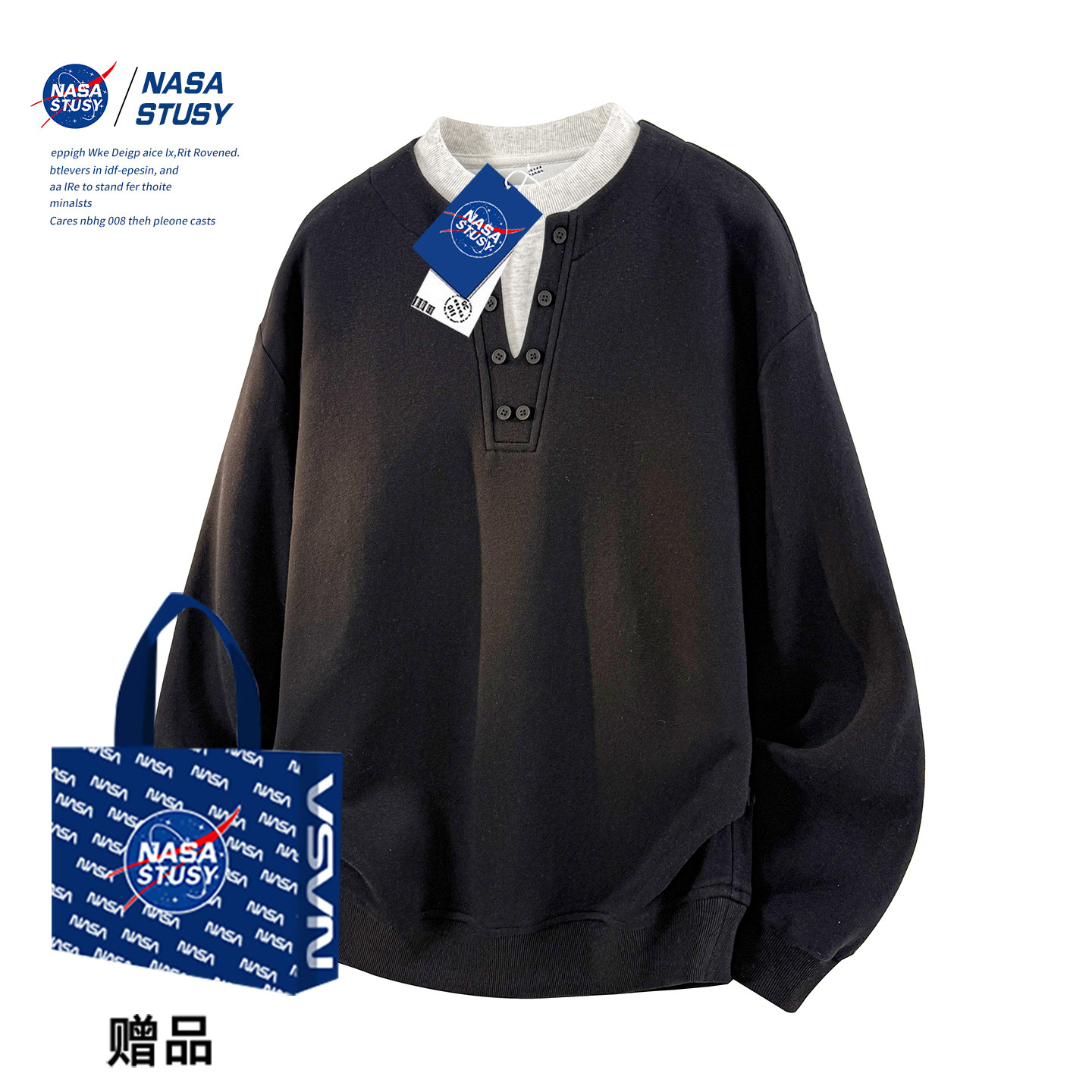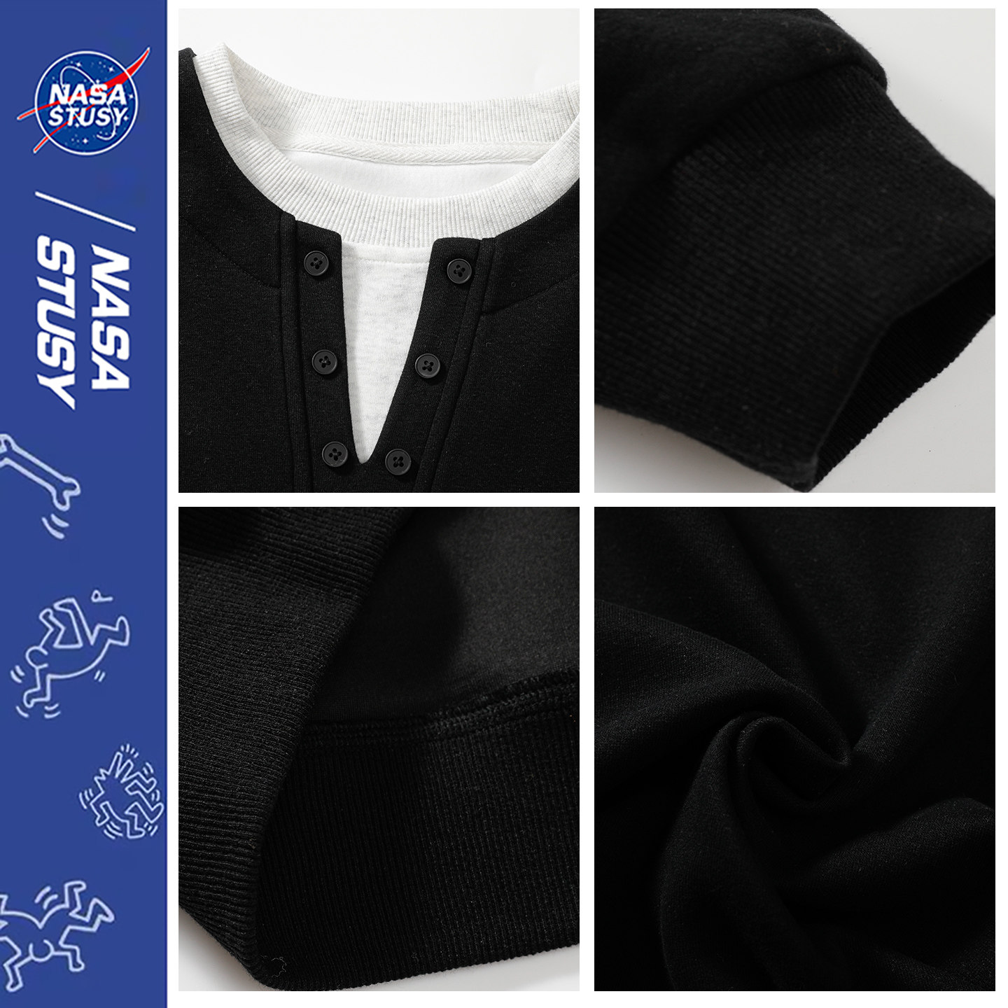 NASA STUSY美式高街2025新款秋冬装男款情侣潮牌亨利领假两件卫衣